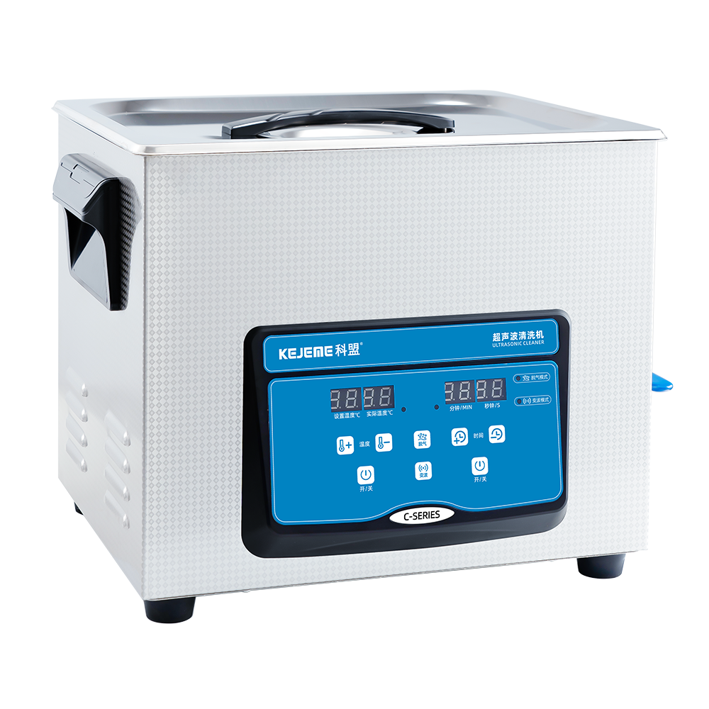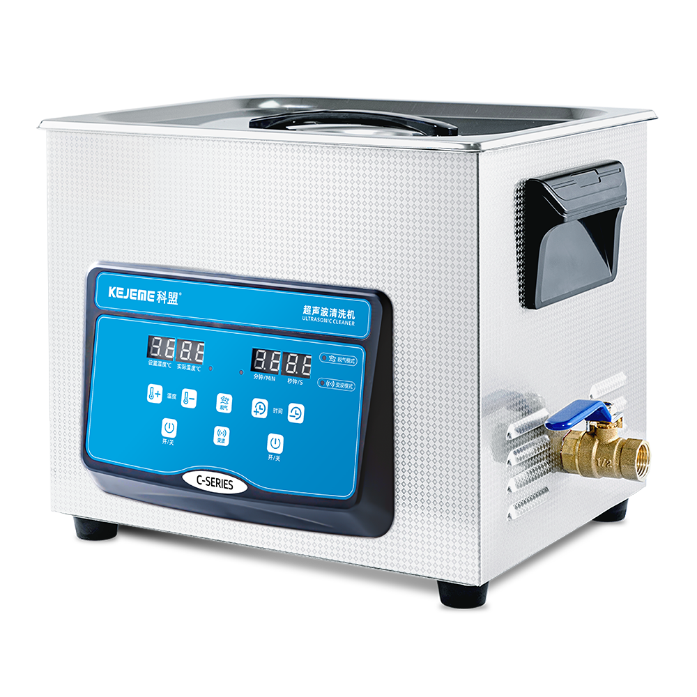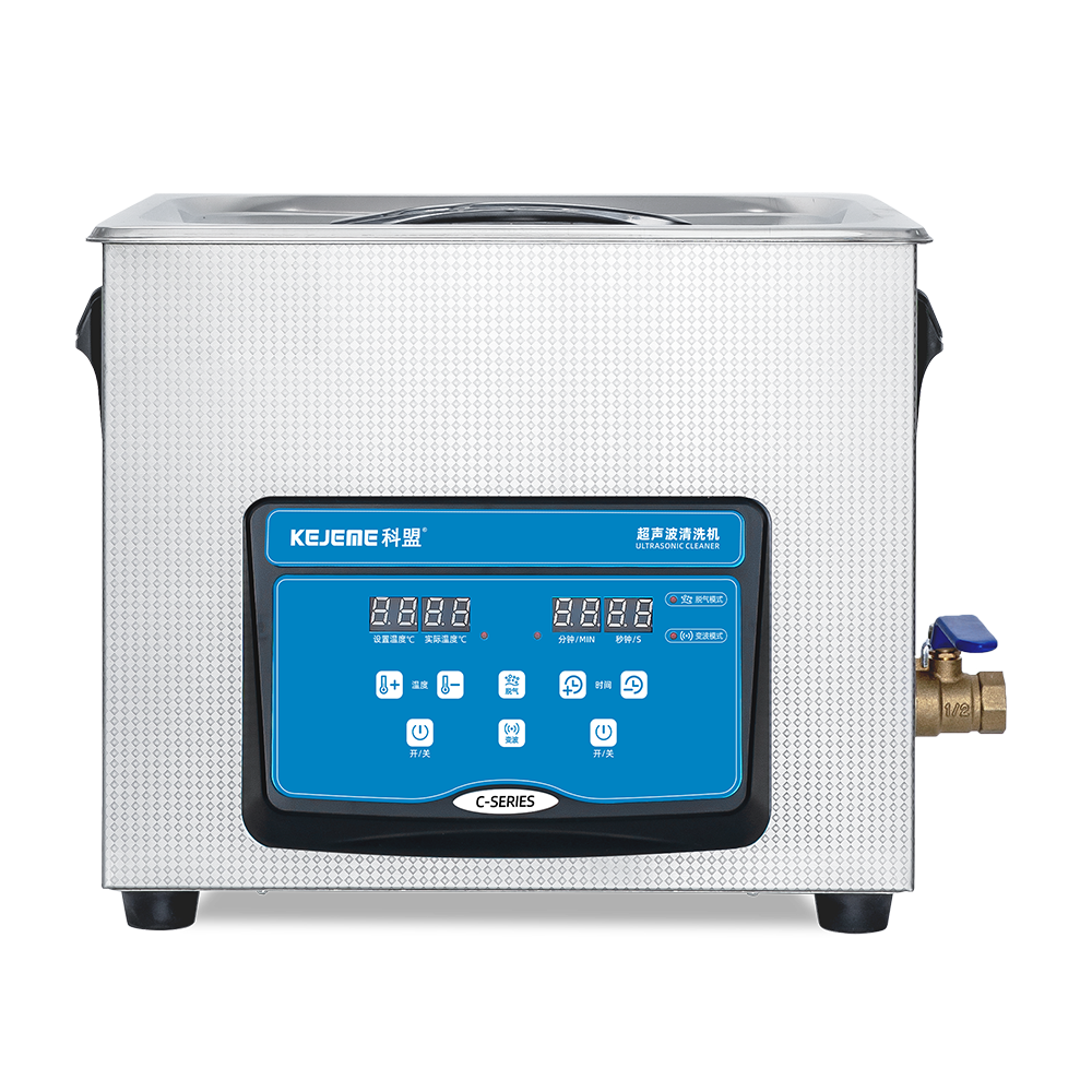 产品型号:KM-410C 内胆材料:SUS304不锈钢冲压槽 震头数量:4枚 容量大小:10 L 超声频率:40KHZ 超声功率:240W/120W 加热功率:200W 时间控制:数显1-30分钟 温度控制:常温-80°C 内槽尺寸:300 x 240 x 150 mm 外形尺寸:325 x 265 x 280 mm 电源电压:AC 220~240V, 50/60Hz 其他功能:脱气、变波