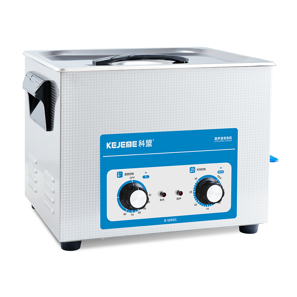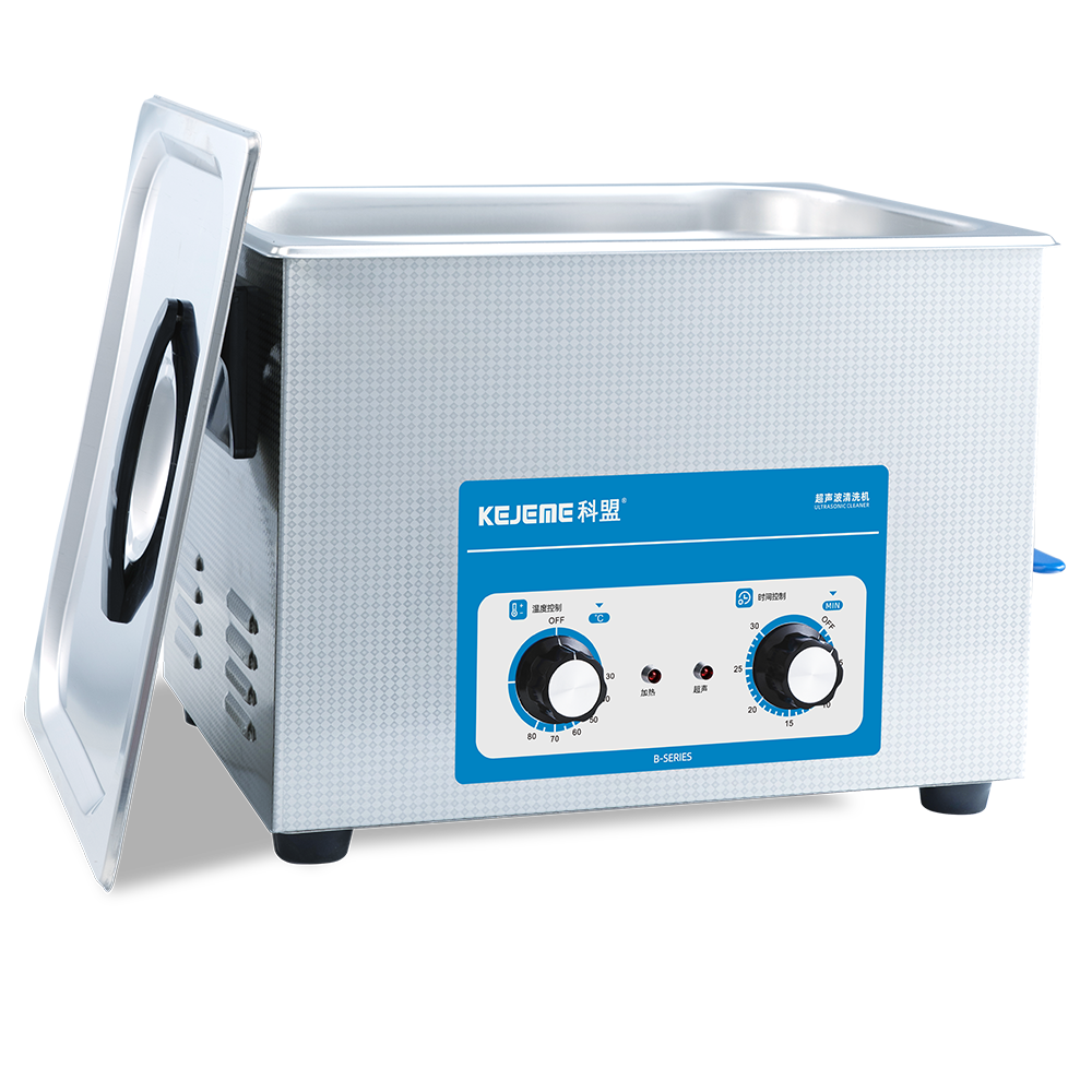 产品型号:KM-615B 内胆材料:SUS304不锈钢冲压槽 震头数量:6枚 容量大小:15 L 超声频率:40KHZ 超声功率:360W 加热功率:300W 时间控制:机械控制定时1-30分钟 温度控制:常温-80°C 内槽尺寸:330 x 300 x 150 mm 外形尺寸:360 x 325 x 285 mm 电源电压:AC 220~240V, 50/60Hz