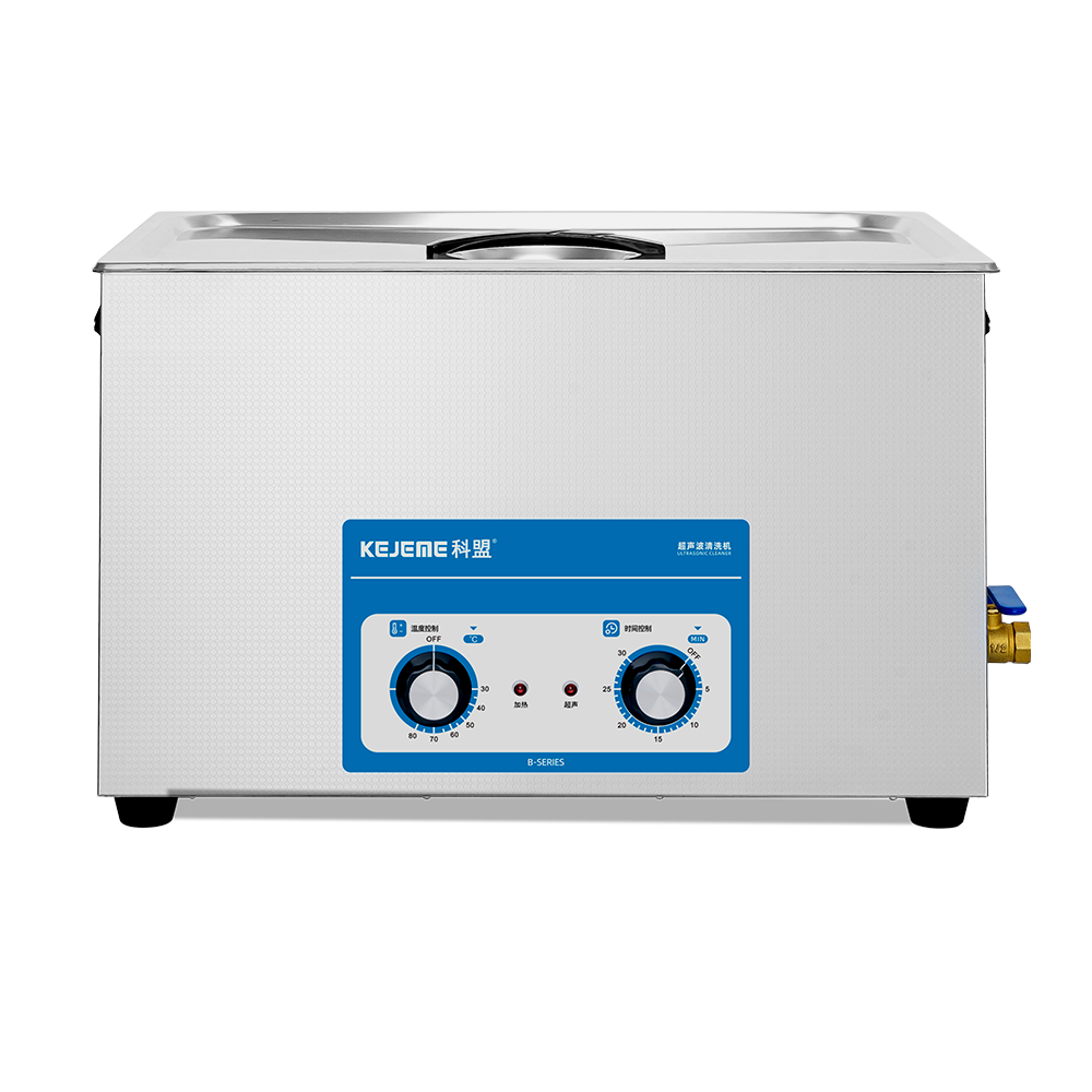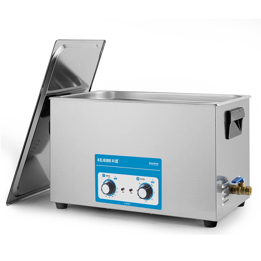 产品型号:KM-1030B 内胆材料:SUS304不锈钢冲压槽 震头数量:10枚 容量大小:30 L 超声频率:40KHZ 超声功率:600W 加热功率:500W 时间控制:机械控制定时1-30分钟 温度控制:常温-80°C 内槽尺寸:500 x 300 x 200 mm 外形尺寸:530 x 325 x 325 mm 电源电压:AC 220~240V, 50/60Hz