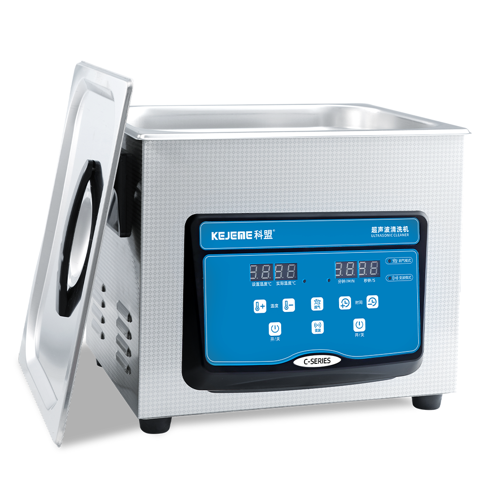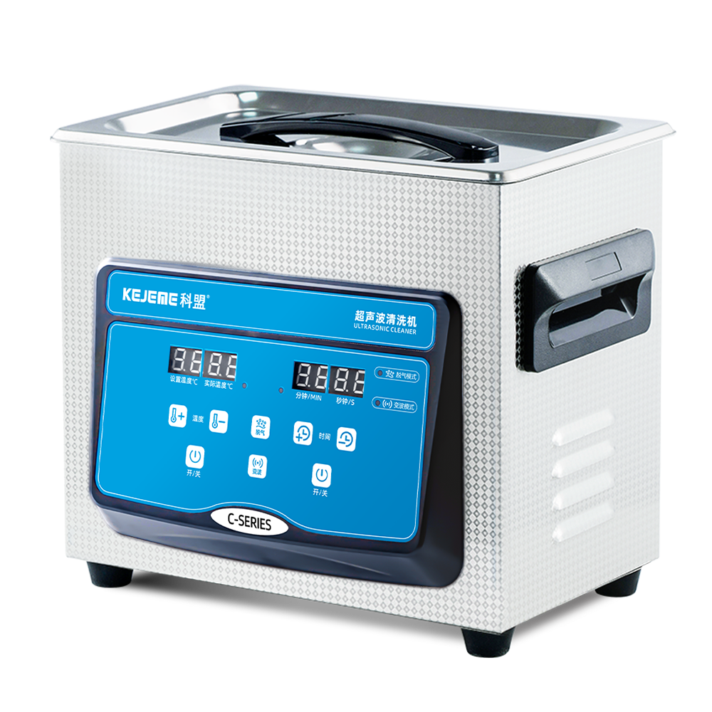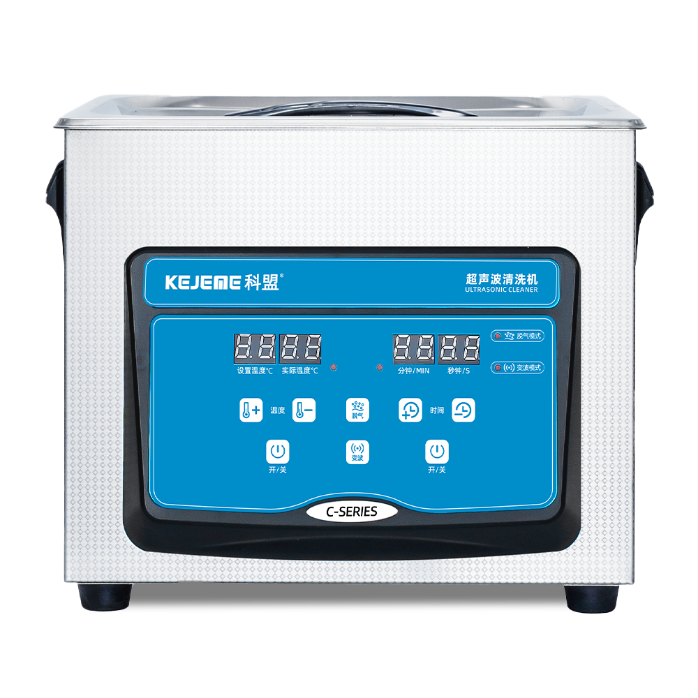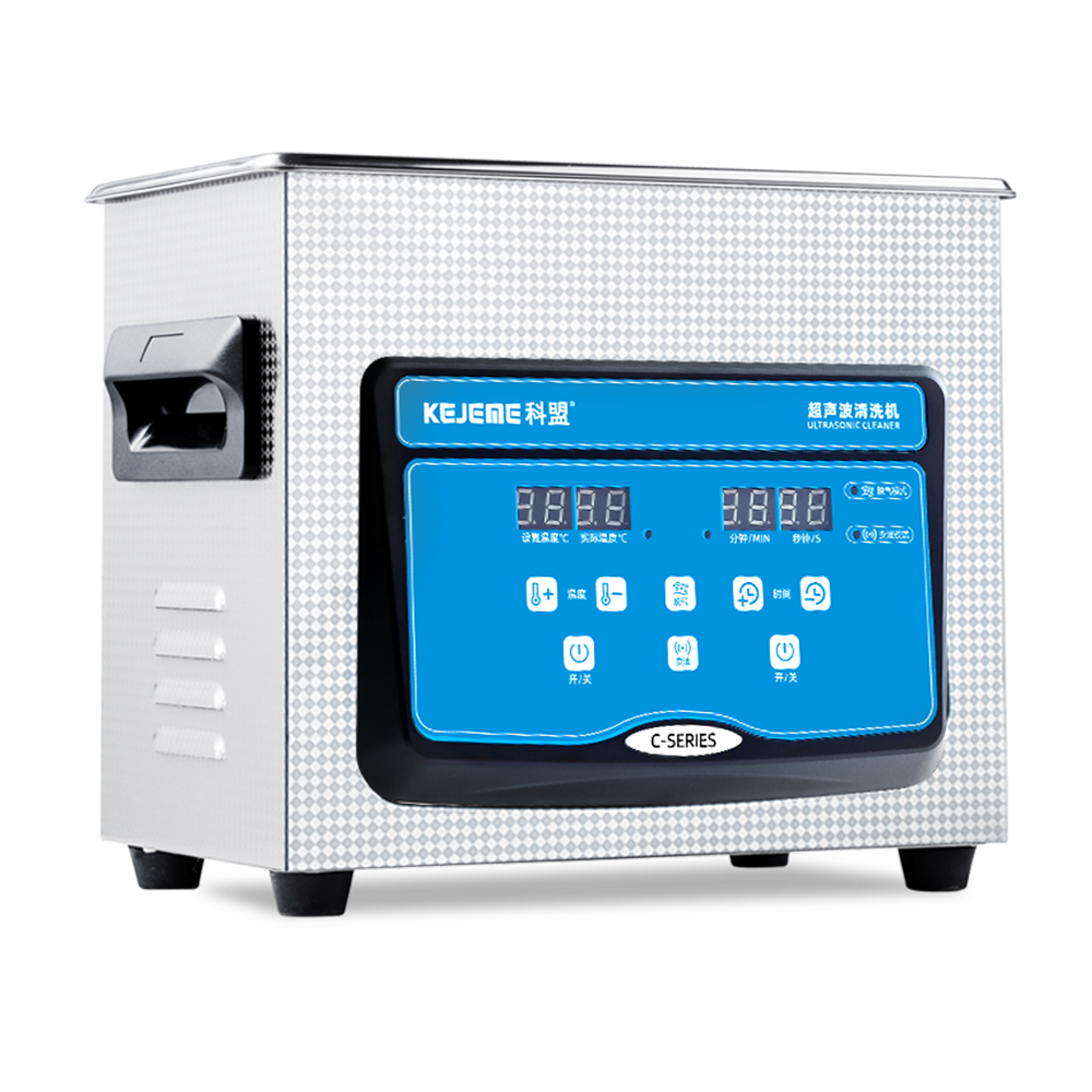 产品型号:KM-23C 内胆材料:SUS304不锈钢冲压槽 震头数量:2枚 容量大小:3L 超声频率:40KHZ 超声功率:120W/60W 加热功率:100W 时间控制:数显1-30分钟 温度控制:常温-80°C 内槽尺寸:240 x 135 x 100 mm 外形尺寸:265 x 165 x 220 mm 电源电压:AC 220~240V, 50/60Hz 其他功能:脱气、变波